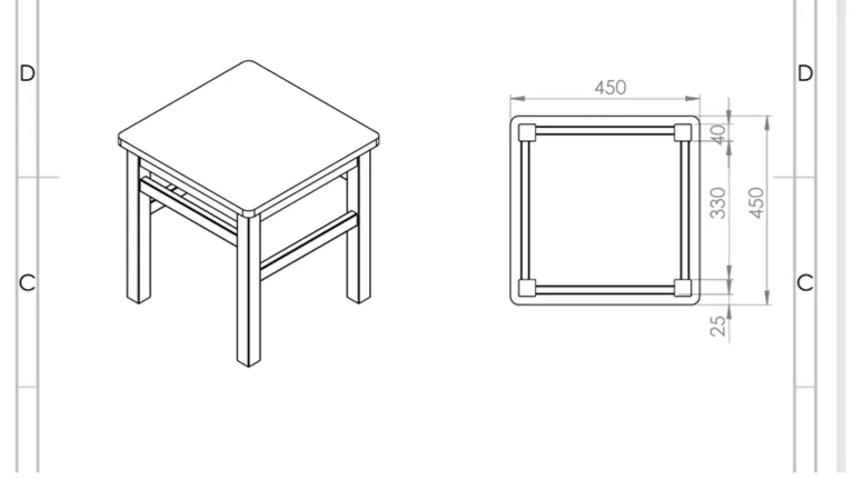 Technical drawing of a simple and elegant coffee table with dimensions 45 x 45 x 47 cm.